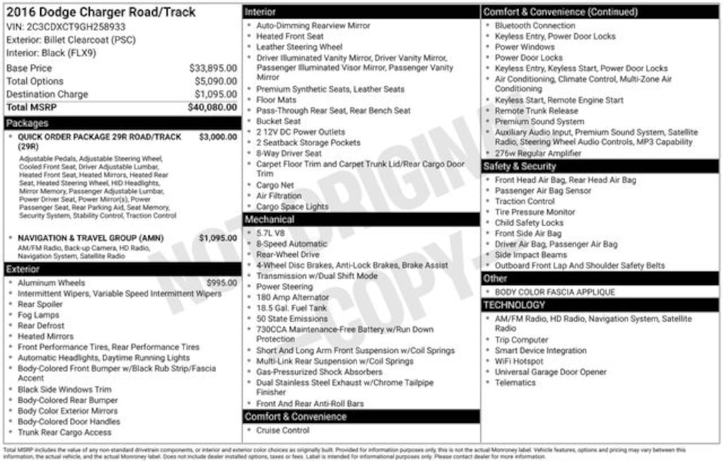 2016 Dodge Charger R/T HEMI 5.7L V8 Multi Displacement VVT 8-Speed Automatic RWD 4D Sedan Billet Silver Metallic Clearcoat Local Trade, 230MM Rear Axle, 3-Mode Electronic Stability Control, 3.07 Rear Axle Ratio, 5-Year SiriusXM Traffic Service, 5-Year SiriusXM Travel Link Service, Alcantara Suede/Nappa Leather Seats, AM/FM radio: SiriusXM, Auto Adjust In Reverse Exterior Mirrors, Auto-Dimming Exterior Driver Mirror, Automatic temperature control, Bi-Function HID Projector Head Lamps, Body Color Exterior Mirrors, Dodge Performance Pages, Driver & Passenger Lower LED Lamps, Exterior Mirrors w/Heating Element, Front dual zone A/C, Front Overhead LED Lighting, GPS Navigation, HD Radio, Heated 2nd Row Seats, Heated Steering Wheel, High Speed Engine Controller, Illuminated Rear Cupholders, Matte Black Grille-Matte Black Xhairs, Navigation & Travel Group, ParkSense Rear Park Assist System, Performance Steering Wheel, Performance Suspension, Power Adjustable Pedals w/Memory, Power Driver/Passenger 4-Way Lumbar Adjust, Power Front Driver/Passenger Seats, Power Heated Memory Mirrors w/Man F/Away, Power Tilt/Telescope Steering Column, Power windows, Quick Order Package 29R Road/Track, R/T Heritage Badge, Radio: Uconnect 8.4 NAV, Radio/Driver Seat/Mirrors Memory, Rear Seat Armrest w/Storage Cupholder, Rear window defroster, Remote keyless entry, Road/Track Performance Group, Security Alarm, SiriusXM Traffic, SiriusXM Travel Link, Super Track Pak, Ventilated Front Seats, Wheels: 20" x 8.0" Polished/Painted Aluminum.