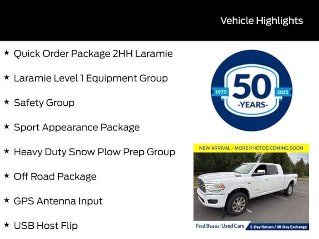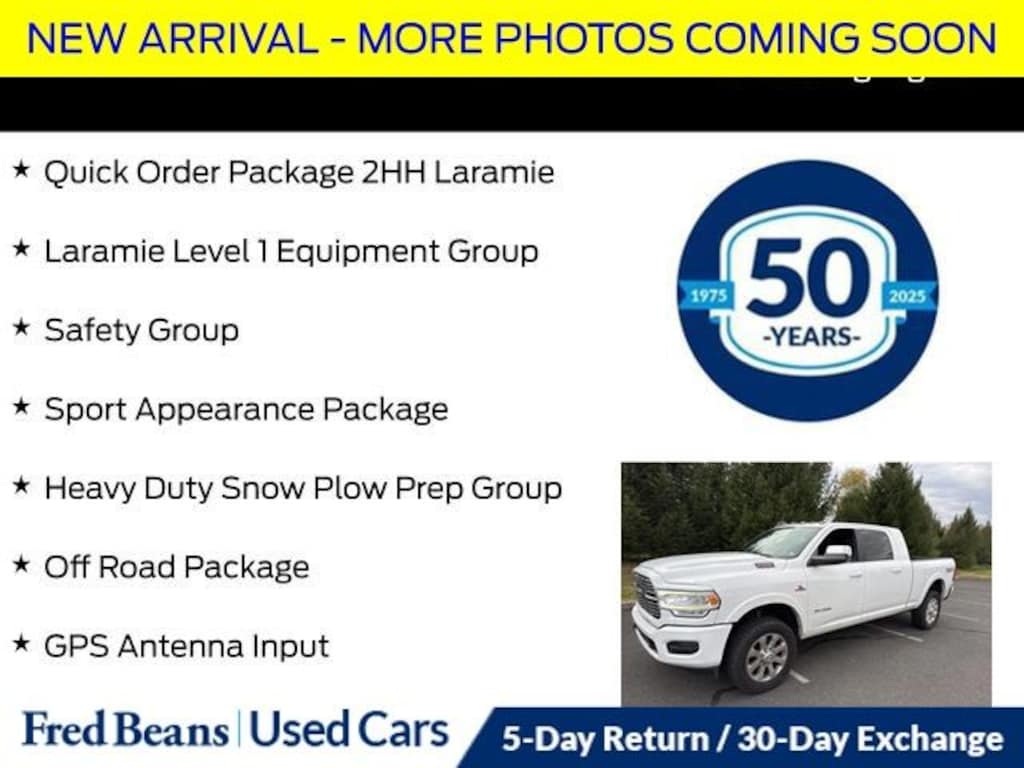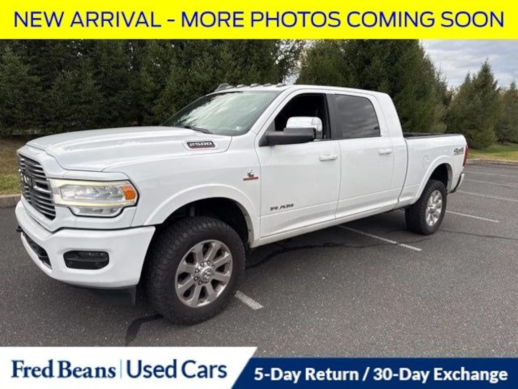Recent Arrival! 2019 Ram 2500 Laramie Cummins 6.7L I6 Turbodiesel 6-Speed Automatic 4WD 4D Mega Cab Bright White Clearcoat 12" Touchscreen Display, Adaptive Cruise Control w/Stop, Apple CarPlay, Auto High Beam Headlamp Control, Automatic temperature control, Black Interior Accents, Blind Spot & Cross Path Detection, Body Color Door Handles, Body Color Grille Surround, Exterior Mirrors w/Memory, Foam Bottle Insert (Door Trim Panel), Front Performance Tuned Shock Absorbers, Full Speed Forward Collision Warning Plus, Google Android Auto, GPS Antenna Input, Heated Front Seats, Heated front seats, Heavy Duty Snow Plow Prep Group, Hill Descent Control, Integrated Voice Command w/Bluetooth, Laramie Level 1 Equipment Group, Mirror-Mounted Aux Reverse Lamps, Off Road Decal, Off Road Package, Painted Front Bumper, Painted Rear Bumper, ParkView Rear Back-Up Camera, Power Adjust 8-Way Driver Seat, Power Adjust 8-Way Front Passenger Seat, Power Adjustable Convex Aux Mirrors, Power Adjustable Pedals w/Memory, Pwr Convenience Chrome Tow Mirrors w/Spotter & Memory, Quick Order Package 2HH Laramie, Radio: Uconnect 12 w/Navigation, Radio/Driver Seat/Mirrors/Pedals Memory, Rain Sensitive Windshield Wipers, Rear Performance Tuned Shock Absorbers, Remote Tailgate Release, Safety Group, Single Disc Remote CD Player, SiriusXM w/360L, Sport Appearance Package, Sport Decal, USB Host Flip, Ventilated Front Seats, Wheels: 18" x 8.0" Polished Aluminum.